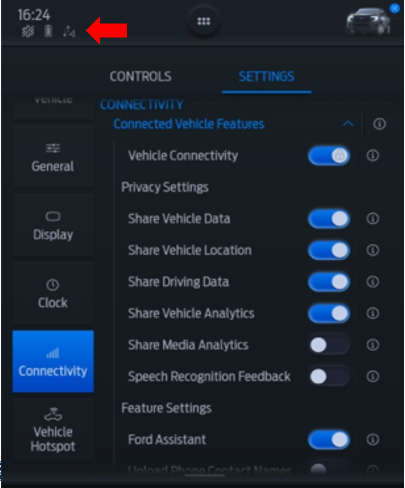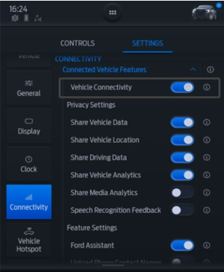 Khi “Vehicle Connectivity” ở trạng thái ‘bật’, điều này có nghĩa là modem FordPass Connect kết hợp với mạng của các nhà cung cấp dịch vụ viễn thông, sẵn sàng nhận và truyền dữ liệu tới Ford. Nếu không được bật, không có dữ liệu nào được gửi đến Ford.