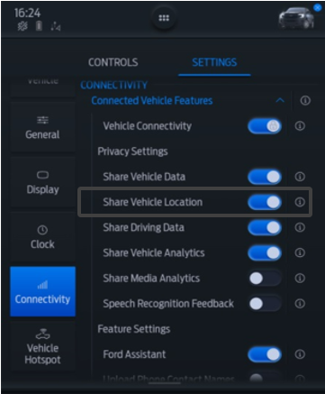 Khi “Share Vehicle Location” được "bật", dữ liệu được gửi đến Ford là vị trí GPS, tốc độ và hướng di chuyển của xe.